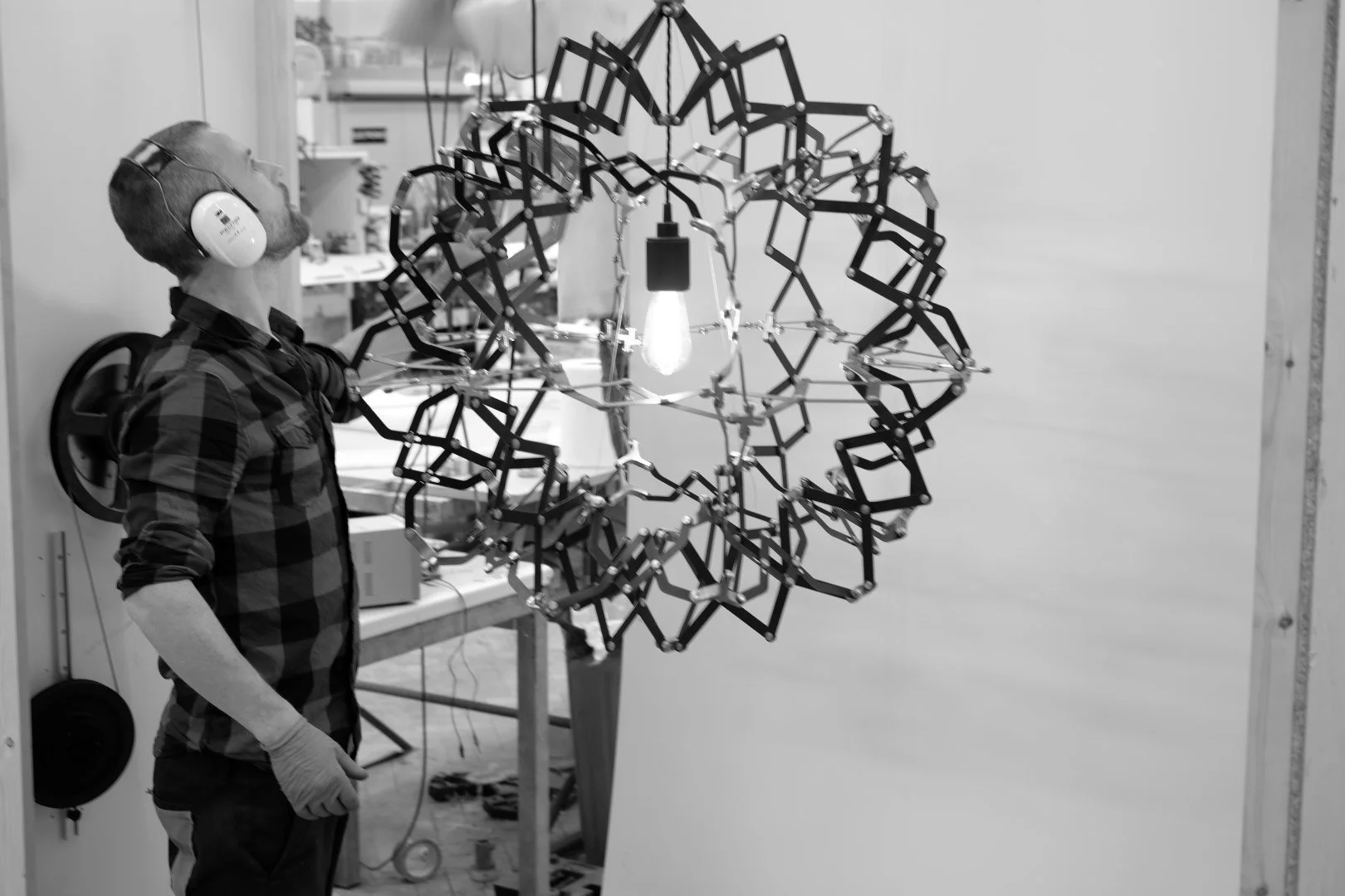 Amalgam was approached by Acrylicize to reimagine the popular children's toy, the Hoberman Sphere, as a functional lighting centerpiece. We reverse-engineered the toy and developed a fully functional 3D model, adapting its design elements to suit our construction methods. The individual arms were laser-cut from 0.5mm steel, then blackened and oiled for a refined finish. The hinge nodes were produced using SLS 3D printing and subsequently metal-plated in copper. We utilized custom-plated bookbinding screws for all fixings, ensuring both durability and a sleek appearance. Not only does the mechanism expand and contract, but it also drives pulley wheels at either end of the room. The installation was completed with a lighting fixture from Buster and Punch.