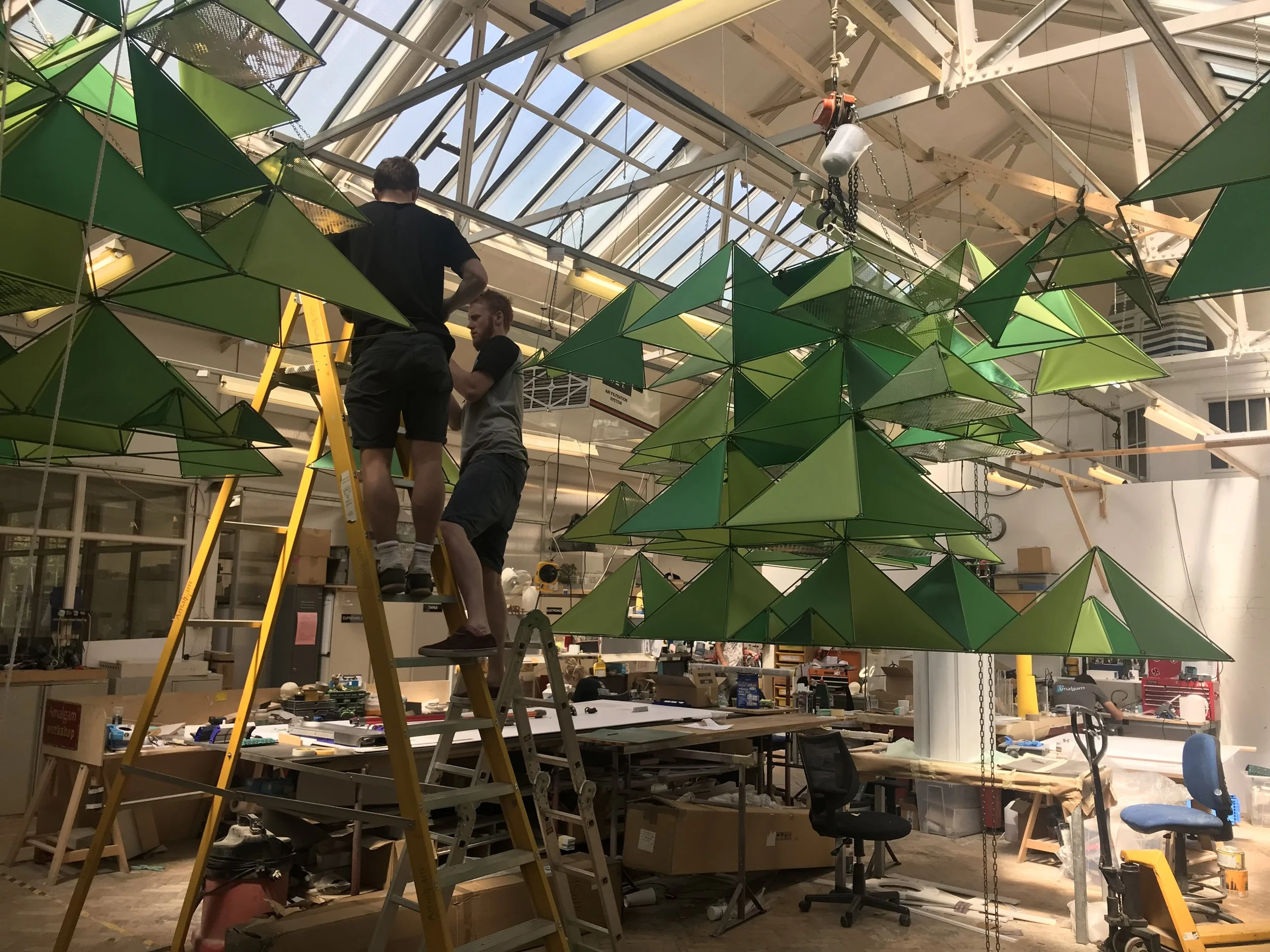 Welded and powder coated steel frameworks, tensioned fabrics, DMX controlled lighting.